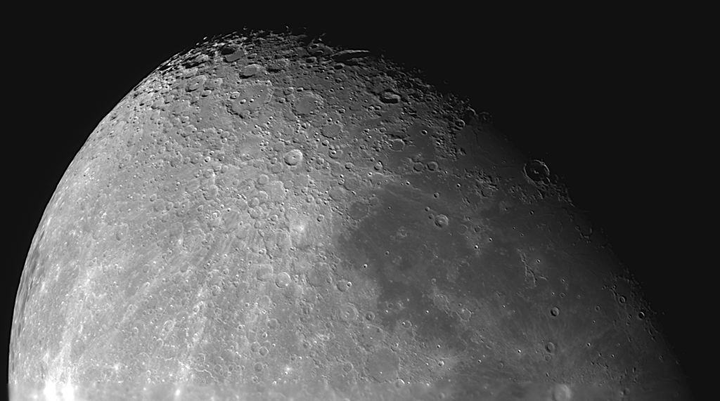 An diesem Abend war es zwar sehr klar, allerdings blies ein unangenehmer starker, kalter Ostwind, der auch die Luft sehr unruhig machte. Keine einfachen Bedingungen. Um eine solche Aufnahme zu erhalten, habe ich an meinem 80/600 ED-Refraktor eine QHY-5-III-462C CMOS-Kamera mit einer 2-fach Barlowlinse angeschlossen. Damit konnte ich eine Brennweite von 1.200 mm erreichen, welche am Mond schon eine Anzahl an Details zeigt. Das gezeigte Bild ist allerdings kein einzeln aufgenommenes Bild, sondern der Extrakt aus einem Videofile mit 1.500 Bildern, welches mit der Software SharpCap aufgenommen wurde. Mittels Autostakkert und Registax 6.0 wurde dieses File nach den besten und schärfsten Einzelbildern durchsucht. Diese wurden danach gestackt, exakt ausgerichtet und mit sogenannten Wavelet-Filtern geschärft. Eine weitere Bearbeitung fand mit Photoshop statt. Eine genauere Beschreibung meines Workflows hierzu folgt später einmal. Fürs Erste ein ganz annehmbares Ergebnis mit doch relativ geringen Mitteln. Aber es zeigt, was mit einem kleinen Refraktor mit nur 600 mm Brennweite heutzutage technisch möglich ist. Eine höhere Auflösung ließe sich mit einem Teleskop mit mehr Öffnung und Brennweite erzielen.