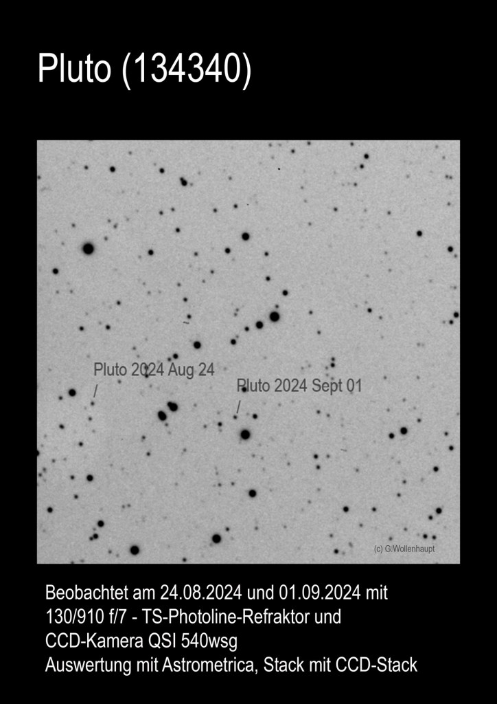 Venus am Taghimmel, TS 130/910 APO – Refraktor, Canon EOS 6D IIPluto im August 2023. TS 130/910 Photoline Refraktor mit QSI 540 wsg. Collage aus zwei zeitlich versetzten Aufnahmeserien