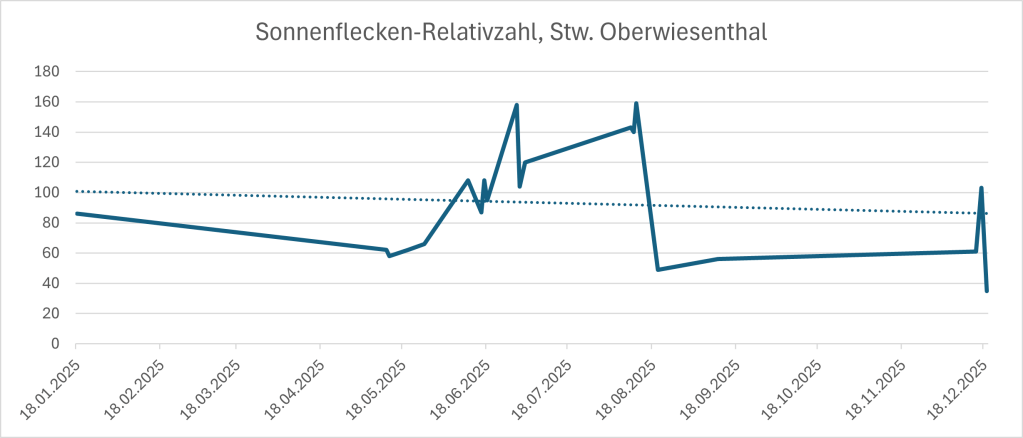 An dieser Stelle sammle ich meine Beobachtungen der Sonnenaktivität, speziell der Anzahl der Sonnenflecken und daraus die entsprechende Relativzahl. Diese ist ein Kriterium für die Bestimmung der Sonnenaktivität im Verlauf des 11-jährigen Aktivitätszyklus der Sonne. Die Beobachtungsserie startet ab 18.01.2025 und erfasst Beobachtungen von meinem Arbeitsort Erfurt oder aus Oberwiesenthal.