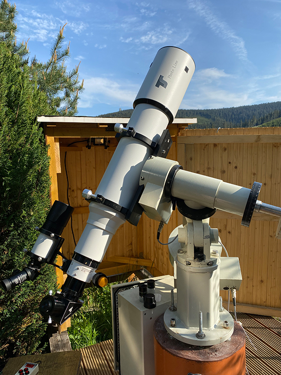 Auf dieser Montierung kann bei klarem Wetter ein 130/910 TS-Photoline-Refraktor befestigt werden, der entweder für die visuelle Beobachtung oder für die Astrofotografie genutzt wird. Gesteuert wird derzeit mit einer FS-2-Steuerung von Astroelectronic. Als weiteres Teleskop steht ein Skywatcher 80/600 ED zur Verfügung. Dieser wird für Justagearbeiten, photografische Beobachtungen von Veränderlichen Sternen, Beobachtungen der Sonne im Weißlicht und H-alpha genutzt. Zum Einsatz kommen auch verschiedene Kameras.